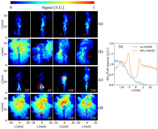 The fuel accelerates into the combustion chamber in the first three phases until 158° for the forced cases with 80% FMFRF, as displayed in Figure 8c,d. A large-scale vortex pair is periodically generated in the shear layer between the fuel jet and the recirculating product, which stretches the flame surface. The CH2O-PLIF signal forms a pair of bulges and is enhanced in the strong vortex (highlighted by the red rectangle). It is attributed to the preheating effect of surrounding hot, exhausted gases, which is helpful to the CH2O formation. The SO2-PLIF signal intensity along the radial direction at the downstream position of z = 18 mm (marked by the red dotted line in Figure 8b,d) for the cases with and without FMFRF is quantitatively compared in Figure 8e, highlighting the temperature rises in the shear layer on both sides corresponding to x~−5 and 3 mm (x = 0 mm is the burner center) under FMFRF. Local extinction events are rarely observed under FMFRF, and the CH2O- and SO2-PLIF distributions are continuous, which increases combustion efficiency with less fuel leakage, which explains the average temperature rise in the CRZ.