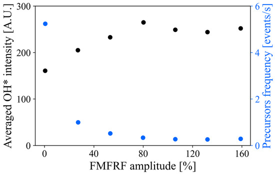 Every time-resolved OH*-CL image was area-integrated, and the global OH*-CL signal intensity was calculated for all test conditions with varying FMFRT amplitude, as shown in Figure 11. The average number of precursor events that occurred per second in every condition is also shown in Figure 11. Specifically, a precursor before global blowoff is defined as long as the OH*-CL signal drops below a certain threshold, which was set as 50% of the averaged OH*-CL signal of the steady case in the current study. The statistical results of the global OH*-CL signal in Figure 11 are consistent with the observation in Figure 5. The frequency of the precursor occurrence dramatically decreases when the external acoustic forcing is applied to the fuel. The flame is more stable under a higher FMFRF applied on the fuel jet, and the corresponding blowoff limit is extended. When the FMFRF is beyond 100%, the frequency of the precursor events is approximately the same for different conditions, which has already been demonstrated in Figure 9.