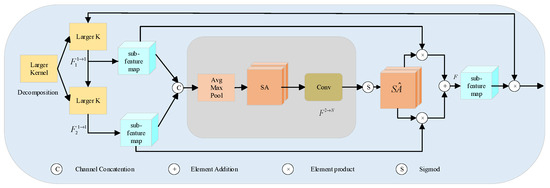 A large kernel convolution can be divided into the three following components: a spatial depth-wise convolution, a depth-wise dilation convolution, and a channel convolution (1 × 1 convolution) [24]. Following the methodology outlined in reference [23], the output of LSKA can be obtained as follows.