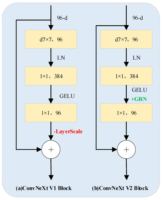 The ConvNeXt V2 model is a convolutional neural network derived from the ConvNeXt model, incorporating self-supervised learning techniques and architectural improvements. It integrates the Fully Convolutional Mask Autoencoder (FCMAE) and Global Response Normalization (GRN) layers to enhance the feature competition among channels. Through methods such as global feature aggregation, feature normalization, and feature calibration, ConvNeXt V2 strengthens the inter-channel feature competition [28], thereby increasing the contrast and selectivity among channels. This enhancement improves the feature extraction capability of the backbone network on complex images. A comparison between ConvNeXt V2 Block and ConvNeXt V1 Block is illustrated in Figure 5.