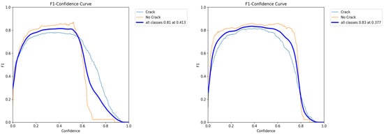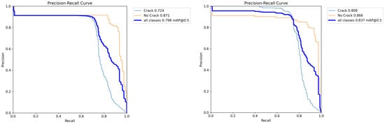 After training the improved CL-YOLOv8 model on a self-curated crack dataset and testing it on 309 images, significant performance enhancements were evident. The training results revealed an accuracy of 85.3%, a recall rate of 83.2%, and a mean average precision (mAP) of 83.7%. As evidenced by the precision–recall (P–R) curve, compared to the original model, both the accuracy and mAP values for crack detection saw improvements. The F1-confidence curve graph demonstrated a notable increase in detection confidence for both the crack and no crack categories. This suggests that, by introducing the LSKA attention module and replacing the backbone feature extraction network, the CL-YOLOv8 model exhibited a higher precision and feature extraction capability in the task of detecting cracks in fair-faced walls. The results are illustrated in Figure 7 and Figure 8.