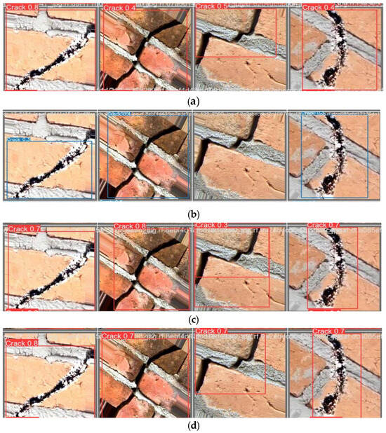 In comparison to existing methods, such as traditional image processing or non-AI-based techniques like ultrasonic or infrared thermography, the proposed algorithm demonstrated a superior adaptability to varying conditions. While these traditional methods are effective under controlled circumstances, their sensitivity to environmental changes is a limitation. By leveraging the strengths of advanced deep learning architectures, CL-YOLOv8 offers a more comprehensive solution for crack detection in diverse environments, which is crucial for maintaining the structural integrity of historical buildings. The test results for whether the fair-faced wall had cracks are shown in Figure 9.