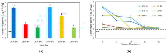 Listeria monocytogenes counts in the pesto samples having 34 or 54% oil content and different processing methods on day 1 (a) and during 60 days of storage (b). Data represent the mean ± standard deviation of three independent replicates; different superscript letters in each column indicate significant differences (p < 0.05). LNP: non-processed samples with L. monocytogenes, LTP: thermal-processed samples with L. monocytogenes, LHP: HPP samples with L. monocytogenes. LOD: limit of detection (2 log CFU/g).