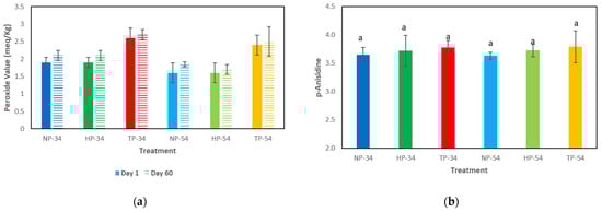 Effect of HPP and thermal processing on lipid oxidation in pesto sauce. (a) Peroxide value results in day 1 (solid fill) and 60 (pattern fill) of storage time, (b) p-anisidine value results after 60 days storage time. Data represent the mean ± standard deviation of three independent replicates; different superscript letters in each column indicate significant differences (p < 0.05, Same letters mean no significant differences). NP-34: 34% oil-content non-processed sample, HPP-34: 34% oil-content HPP sample, TP-34: 34% oil-content thermal-processed sample, NP-54: 54% oil-content non-processed sample, HPP-54: 54% oil-content HPP sample, TP-54: 54% oil-content thermal-processed sample.
