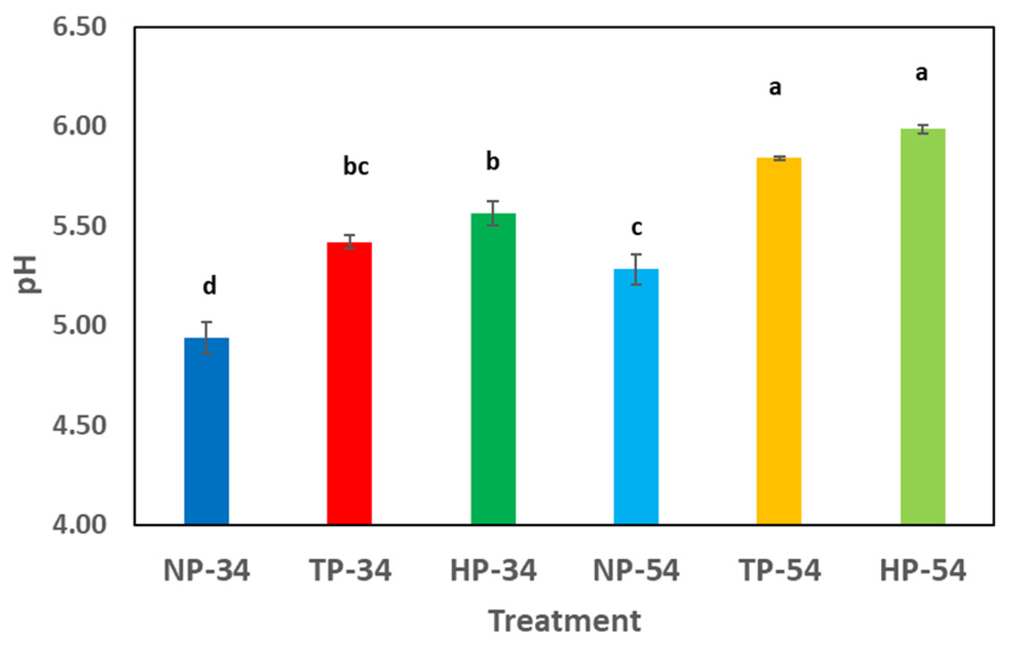 Effect of HPP and thermal processing on pH in pesto sauces. Data represent the mean ± standard deviation of three independent replicates; different superscript letters in each column indicate significant differences (p < 0.05). NP-34: 34% oil-content non-processed sample, HPP-34: 34% oil-content HPP sample, TP-34: 34% oil-content thermal-processed sample, NP-54: 54% oil-content non-processed sample, HPP-54: 54% oil-content HPP sample, TP-54: 54% oil-content thermal-processed sample.
