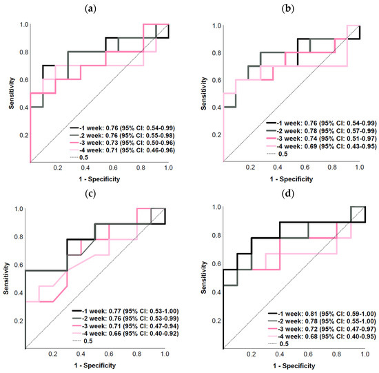 | AUC | p | Cut-Off | Sens/ Spec | AUC | p | Cut-Off | Sens/ Spec | AUC | p | Cut-off | Sens/ Spec | AUC | p | Cut-Off | Sens/ Spec | |