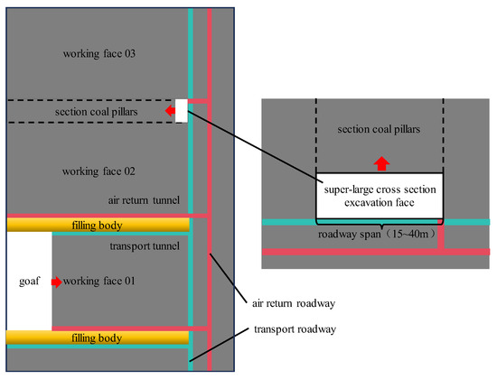 Although rapid roadway excavation technology [33] is in a very mature development stage in China, conventional roadways with large sections (the open-off cut is 6 to 10 m wide) are made inefficiently via multiple excavation [34,35]. Figure 1 shows a schematic drawing of interface coal pillar “excavation–backfill–retention” integration. The integrated coal pillar excavation, filling and retention process between coalfaces can achieve pillar-free mining and improve the coal resource recovery rate; meanwhile, two roadways are retained and one excavation face is reduced in size, thus improving the excavation efficiency. By backfilling with high-performance gangue filling material [36,37], the mining gangue can be disposed of completely, with no need for outward transport. In order to ensure the safety of filling roadway and the complete recovery of gangue., roadways with super-large sections and a width ranging from 15 m to 40 m should be excavated for coal pillars between coalfaces. At the same time, as there is an unsupported roof distance in the coal pillar excavation, filling and retention process between coalfaces, a well-detected stress status of the overhanging roof of the roadway with super-large sections can create theoretical references for supporting such roadways and thereby help achieve the rapid excavation of such roadways and a safe and stable driving face.