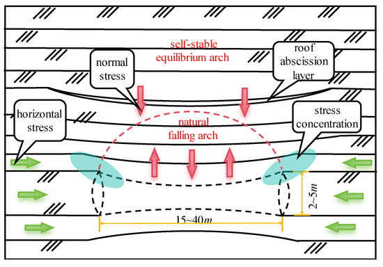 Figure 2 illustrates the stress and deformation characteristics of a super-large-section roadway. As there is a large area of unsupported roof when the support is not yet ready during the roadway excavation with super-large sections, ranging from 15 m to 40 m, the stress concentration on surrounding rock at the roadway corner results in shear failure and further intensifies the deformation and failure of the roof. A large-span roof subject to driving disturbance will result in bed separation [38]. Gravity stress on the large-span overhanging roof will cause the roof to crack and thereby result in tensile failure. Eventually, a natural caving arch will take shape, and a self-stabilized equilibrium arch will appear outside the caving arch [39].
