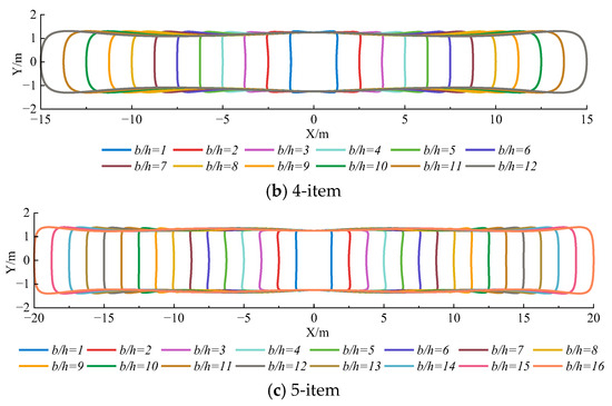 Through analysis of the mapping results from different mapping terms in Table 1, we determined the maximum error of conformal transformations of different terms. When studying Figure 4, which presents the effect of mapping with different accuracies, it is not difficult to see that an increase in the number of terms taken by mapping function Z can improve the mapping effect. According to Figure 4a, when the aspect ratio b/h increased from 1 to 6, the mapping effect weakened gradually; when the number of mapping function terms was taken as 3, there were large errors between the roof, the base plate and these two sides in the mapping section and the straight boundary in the theoretical section, and the error was even larger at the roadway corner; it was more like an arc shape. This error can be narrowed by increasing the number of terms. According to Figure 4b,c, when the number of terms is increased by one each time, the mapping value will be more like the outline of rectangular roadways, and the subsequent laws will be more like those on-site.