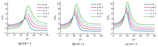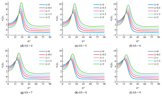 In order to study the laws on the influence of different side-pressure coefficients on the stress distribution in the surrounding rock of rectangular roadways, tangential stresses upon the roadway in those nine models were calculated when the vertical force was P0 and the acting points b/h were from 1 to 9. In Figure 7, tangential stress distribution curves are given of roadway surrounding rock under different side-pressure coefficients. Here, the curves of the stress distribution in the surrounding rock of rectangular roadways are displayed under five conditions, where the side-pressure coefficients λ were 0, 0.5, 1, 1.5 and 2, respectively.