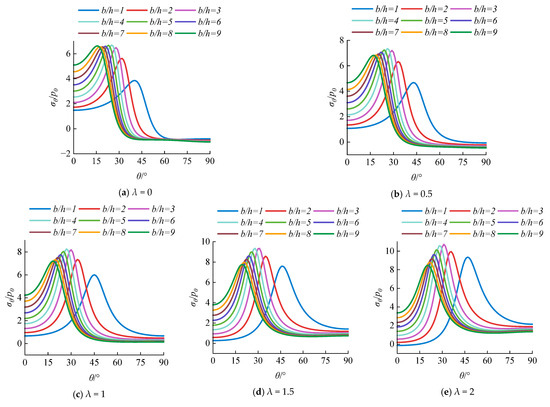 In order to study the laws on the influence of different aspect ratios on the stress distribution in surrounding rock of rectangular roadways, tangential stresses in a total of five roadway models were calculated when the vertical force was P0 and the side-pressure coefficients λ were 0, 0.5, 1, 1.5 and 2. Figure 6 shows tangential stress distribution curves of roadway surrounding rock with different aspect ratios. The stress distribution for surrounding rock in rectangular roadways is displayed under nine different changing conditions of side-pressure coefficients, where roadway aspect ratios b/h were from 1 to 9.