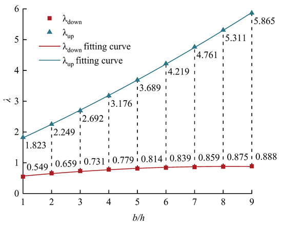 Threshold values λup and λdown, between which there is no tensile stress upon the roadway boundary, were calculated via Equation (23). When λ is larger than λup, tensile stresses take place on both side walls of the roadway; when λ is smaller than λdown, tensile stress takes place on the roof; when λ is larger than λup but smaller than λdown, compressive stresses take place on all roadway boundaries. According to Figure 8, as the roadway aspect ratio increased from 1 to 9, its λup increased from 1.823 to 5.865 and its λdown increased from 0.549 to 0.888. When these side-pressure coefficients of the environment where the roadway is located exceed these threshold values, tensile stress takes place on the roadway boundary, triggers tensile failure and thereby causes instability in a roadway with super-large sections.