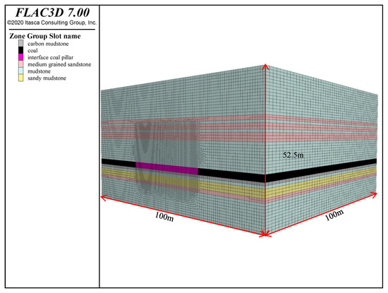 The driving face in the No. 210 mine roadway with super-large sections was taken as the engineering background for a 3D numerical simulation model, which was established as shown in Figure 9. FLAC3D 7.00 numerical simulation software was adopted to study both stress distribution laws and deformation and failure behaviors concerning the surrounding rock of unsupported rectangular roadways with super-large sections. In order to mitigate the influence of the boundary effect, the design model was 100 m in length along the strike, 100 m in dip length and 52.5 m in height. The model was divided into 450,200 units and 465,681 nodes. The Mohr–Coulomb constitutive model was adopted for the stratum, and its parameters were assigned according to the values given in Table 4. The roadway had a buried depth of 200 m, its bulk density γ was 25 KN/m3, and both the perimeter and bottom of the model were subject to fixed constraints. In light of the requirement for calculation accuracy, mesh encryption was applied upon surrounding rock near the excavation zone of coal pillars between coalfaces.