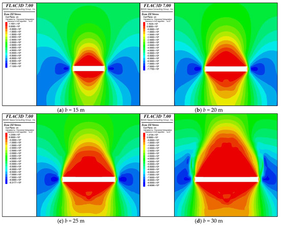In order to study the influence of the width of the roadway with super-large sections upon the deformation and failure of surrounding rock, four groups of models were designed with their roadway widths as 15 m, 20 m, 25 m and 30 m; the height as 2.5 m; the side-pressure coefficient λ as 1; and the buried depth as 200 m. The numerical simulation results were as follows: With different aspect ratios, the perpendicular stress field cloud map concerning the surrounding rock of excavated roadways was generated, as shown in Figure 10. Moreover, the displacement degrees were measured, as shown in Figure 11 and Figure 12. Finally, the plastic zones were charted, as shown in Figure 13.