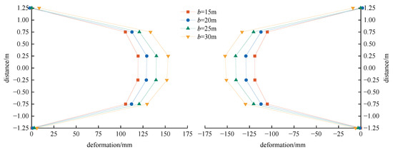 It can be seen from Figure 11 and Figure 12 that, when the roadway widths were 15 m, 20 m, 25 m and 30 m, the maximum deformation degrees in the roadway roof were 61.37 mm, 82.50 mm, 109.34 mm and 152.59 mm, respectively; the maximum deformation degrees in the roadway base plate were 19.89 mm, 24.74 mm, 31.08 mm and 38.17 mm, respectively; and the maximum deformation degrees in the two side walls of the roadway were 238.98 mm, 258.71 mm, 281.07 mm and 306.14 mm, respectively. As the roadway width increases, the deformation quantities in the roof, base plate and two side walls of the roadway also increase. With the roadway width increasing from 15 m to 30 m, the deformation quantities in the two side walls of the roadway increased by 28.10%, and in the roof and base plate of the roadway, they increased by 134.75%, respectively. These results show that the roadway width has a greater influence upon the deformation in both the roof and base plate than that in the two side walls of the roadway.