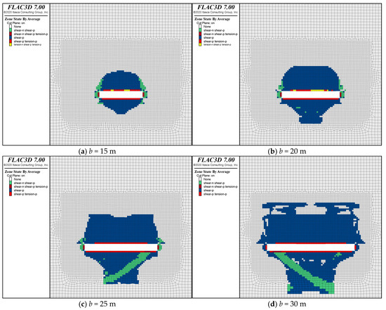 It can be seen from Figure 13 that, when the roadway widths were 15 m, 20 m, 25 m and 30 m, the maximum ranges of the plastic zone were 7 m, 8.5 m, 10 m and 14 m, respectively; as the roadway width increased from 15 m to 30 m, the maximum range of the plastic zone expanded by two times. The roadway surrounding rocks were mainly subject to shear failure, and there was a zone of mixed tensile and shear failures on the roadway boundary. When the roadway width was larger than 25 m, the plastic failure broke through the roof and developed into surrounding rocks. When the roadway width was 30 m, the plastic zone penetrated the hard stratum in the roof and then reached the upper mud stone, causing a damage range much larger than that with a roadway width ranging from 15 m to 25 m. These results indicate that the wider the roadway, the more serious the plastic failure in the roof and the harder the corresponding control measures.