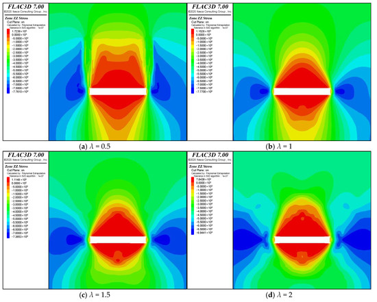 It can be seen from Figure 14 that, when the side-pressure coefficients λ were 0.5, 1, 1.5 and 2, the values of the maximum stress upon the two side walls were 7.76 MPa, 7.77 MPa, 7.37 MPa and 6.94 MPa, respectively, and the stress concentration coefficients were 1.55, 1.55, 1.47 and 1.39, respectively. The larger the side-pressure coefficient, the smaller the value of the maximum vertical stress upon the two side walls of the roadway, and the farther the distance between the maximum stress concentration point and the side walls of the roadway. For the roadway roof, the greater the side-pressure coefficient, the smaller the tensile stress upon its surface, and the greater the compressive stress upon its surface. When λ was equal to 0.5, the maximum tensile stress upon the roadway was 172.39 KPa; and when λ was equal to 2, the maximum tensile stress upon the roadway was 78.44 KPa. It can thus be seen that, with an increase in side-pressure coefficient, the perpendicular stress on both side walls of the roadway decreases as a whole, and that roadway roof is subject to both compressive stress from the overlying stratum and tensile stress from its own weight, and, therefore, is more susceptible to bed separation and fracture.