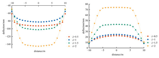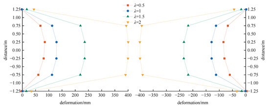 It can be seen from Figure 15 and Figure 16 that, when the side-pressure coefficients λ were 0.5, 1, 1.5 and 2, the maximum deformation quantities in the roadway roof were 92.64 mm, 82.50 mm, 102.43 mm and 144.94 mm, respectively; the maximum deformation quantities in the roadway base plate were 22.37 mm, 24.74 mm, 42.96 mm and 74.13 mm, respectively; and the maximum deformation quantities in the two side walls of the roadway were 169.73 mm, 258.71 mm, 471.84 mm and 801.58 mm, respectively. As the side-pressure coefficient increased, the deformation quantities in the roof, base plate and two side walls of the roadway increased accordingly; moreover, the deformation quantities in the two side walls were greater than those in the roof and base plate of the roadway. Upon the side-pressure coefficient increasing from 0.5 to 2, the deformation quantities in the two side walls of the roadway increased by 90.48%, and those in the roof and base plate of the roadway increased by 372.27%, respectively. The increasing range of deformation quantities in both the roof and base plate was much greater than that of deformation quantities in the two side walls. In this regard, synergistic support by an anchor bolt/cable whose elongation can adapt to large deformation without failure can be employed to restrict roof deformation in a roadway with super-large sections so as to avoid roof caving.