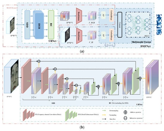 The method proposed in this paper is a customized DMFNet for feature extraction of RGB-IR image pairs. This method mainly includes three stages: single-modal feature extraction, multimodal feature fusion, and recognition. Microexpression changes under natural situations are subtle, making it difficult to capture detailed features. Before single-modal feature extraction from RGB-IR image pairs, URNet is utilized to reconstruct RGB images, capturing more detailed features, which are subsequently input into the feature extraction network. The DMFNet network structure is illustrated in Figure 1a.