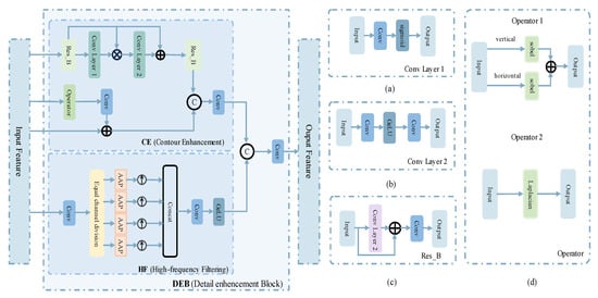 The architecture of the Detail Enhancement Block (DEB). (a,b) represent the convolutional layer. (c) Residual block. (d) Operator 1 uses the Sobel operator in the horizontal and vertical directions, while Operator 2 uses the Laplace operator.