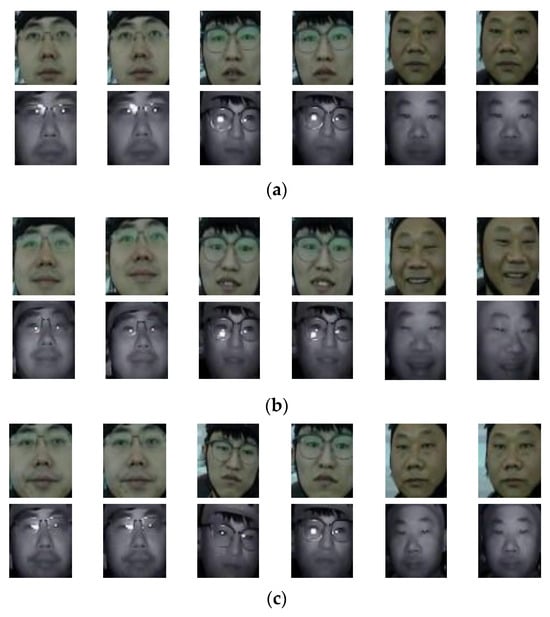 We used Wang et al. [] to analyze the data generation process, which includes three steps: sampling, face detection, and face alignment. Firstly, in the sampling stage, complete emotional data of 40 drivers were selected from the original dataset. Each video had a duration of 30 s and a frame rate of 24 frames per second. To avoid invalid samples (such as images with strong emotional interference), we manually sampled from the video, selecting a total of 9 images for each driver’s emotion. Secondly, in the face detection stage, open-source libraries were employed to detect facial regions, followed by background removal from the images and adjustment of the facial image resolution to 224 × 224. Finally, in the facial alignment stage, by detecting 68 facial feature points, an affine transformation was used to align the drivers’ facial image to restore the geometric structure of the face. This experiment requires RGB-IR image pairs, and the IR dataset was processed the same way as the RGB images. Finally, 2160 images (1080 RGB images and 1080 IR images) were captured from the video. These steps provide preparation for model training and testing.