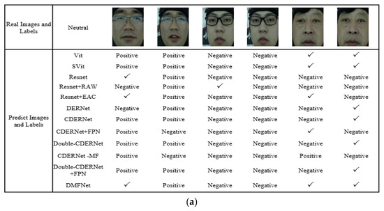 In terms of the evaluation metrics accuracy and F1-score, our DMFNet model has demonstrated superior performance compared to the original CDERNet model and other models. Detailed performance comparisons are provided in Table 1 and Table 2. The qualitative results of our proposed DMFNet and several other models are depicted in Figure 4. CDERNet yielded 13 incorrect predictions out of 18 predicted emotions. Similarly, other models also exhibited errors in emotion recognition predictions. The proposed DMFNet outperforms other models for each emotion category, particularly achieving higher accuracy in identifying positive emotions.