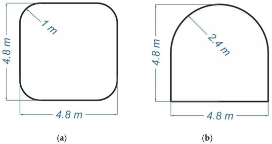 Typical cross-sections of mining excavations for potash mining deposits. (a) Filleted square cross-section, (b) Arched cross-section.
