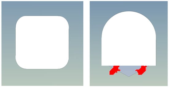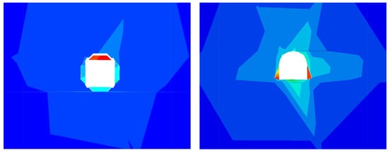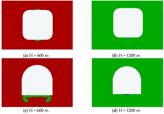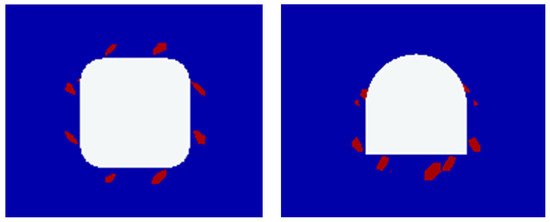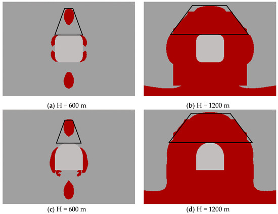 Figure 4, in turn, proves the fact that at great depths, the cross-section of the excavation does not have a significant effect on the stress–strain state of the rock mass in the vicinity of excavations. The size of the cross-section has less influence on the size and shape of limit state zones at great depths than at small and moderate depths. At great depths, the shape of the cross-section has an increasingly localized effect on the limit state zones in the rock mass.