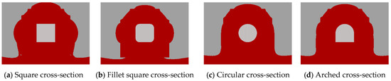 Limit states of the rock mass in the vicinity of mining excavations of different cross-sections at great mining depth (H = 1200 m) according to complex limit state criterion (3). Red color—limit state zones.
