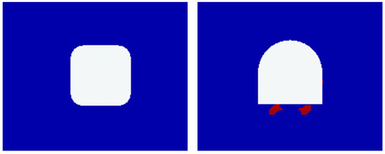 The results of conducted FEM simulations approve that criterion (7) allows to predict the crack propagation and discontinuity formulation in the rock mass more accurately than well-known crack-predictive criteria such as the Griffith criterion [25]. This fact is illustrated by Figure 5 and Figure 6. Those figures show that according to the Lade criterion (7), the formulation of block structure in the vicinity of rectangular excavation occurs at the entire outline, while in the vicinity of arch-shaped excavation the block structure formulates at the bottom and sides of the excavation outline. According to the classic Griffiths criterion, in turn, the block structure formulates only at the bottom of the arch-shaped excavation.