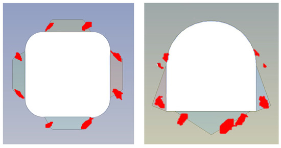 Next, we present the results of the stress–strain state and stability calculation of the mining excavations considering the block-structured rock mass using DEM. As is well-known, algorithms of DEM simulations are different from the algorithms that allow simulation of the behavior of continuous media, such as FEM. The main difference is that in the case of DEM, the considered media consists of separate discrete (distinct) elements and the algorithm considers the contacts and other connections between those elements [23]. In the considered case, the distinct elements are represented by deformable blocks of the rock mass. The contact break happens in the case when the shear of tensile stress exceeds the ultimate value. Note that the proposed algorithm is a modification of the algorithm used in the ITASCA 3DEC v 7.00 software. The results of the DEM simulation are presented below in Figure 9. This figure shows that both excavation failure and rock falls are predicted in the areas where block structure is formed. Thus, in the vicinity of a rectangular-shaped excavation, significant rockfalls are predicted in the roof and sides of the excavation, while in the vicinity of an arched excavation, rockfalls are predicted in the sides of the excavation only. In this case, both excavations are not stable due to the shown rock falls.