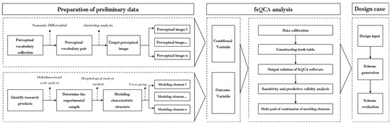 Product styling design elements are diverse, and their combination paths are particularly rich. Different arrangements can significantly impact the product’s style and the psychological feelings conveyed to the user. Various combinations of styling features also influence users’ perceptual imagery differently, necessitating further in-depth study. Therefore, this paper applies the method of perceptual engineering to measure user preference and satisfaction and uses the fsQCA method to quantitatively analyze the relationship between different styling element configurations and users’ perceptual imagery. The specific research methodology and framework of this paper are shown in Figure 1. This figure serves as a roadmap for readers, showing the sequence of steps taken in the research. It effectively connects the theoretical foundation of perceptual engineering with the methodological steps required for fsQCA, ensuring that readers understand how the research framework transitions into practical analysis. The clarity of Figure 1 is essential in linking the conceptual discussion of product styling to the actual data-driven methods used in this study.
