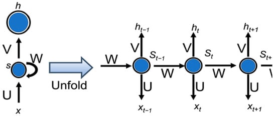 RNN is predominantly utilized for time series analysis and is particularly adept at processing sequential data. A defining feature of the RNN is its state vector (also known as the hidden unit), which forms a singular neural structure for the sequence and retains the memory of all preceding elements. The schematic recursive structure of an RNN incorporating the backpropagation through a time algorithm is presented in Figure 1 [21].