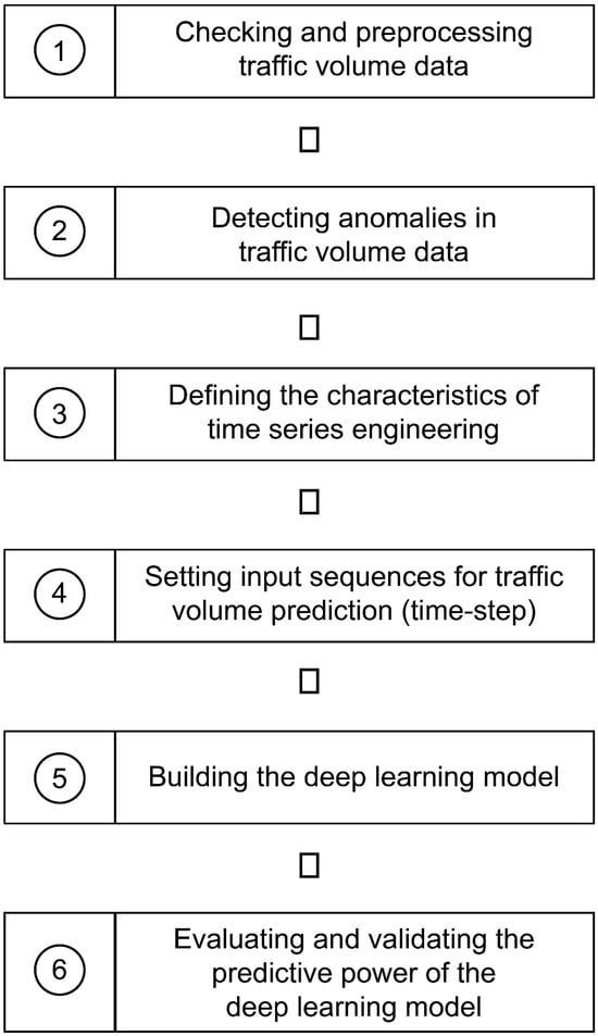 Figure 2 depicts the procedure for developing the deep-learning-based model. Initially, the process involved establishing baseline values for traffic volume data, detecting anomalies in the raw data, and conducting data validation and preprocessing to correct and predict the traffic volume. Subsequently, datasets were organized for anomaly detection in traffic volume data, including a training set exclusively comprising normal values, a validation set with normal values, a secondary validation set containing both normal values and anomalies, and a test set comprising both normal values and anomalies. The third step involved defining the characteristics of the data to ensure appropriate data transfer suitable for each deep learning structure before the actual implementation of the deep learning model. The fourth step addressed the challenge of gradient vanishing during data analysis by setting input sequences for traffic volume prediction to construct the deep learning model. An architecture was then developed to evaluate and validate the predictive power of the devised model.