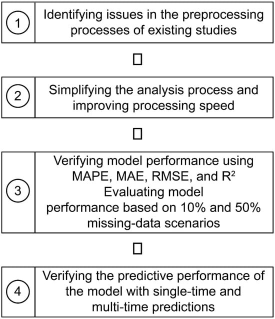 Previous studies have commonly employed a preprocessing process to correct data anomalies before training the deep learning models. This approach, although necessary in the absence of actual values, tends to complicate the analysis process and significantly reduces the processing speed. Moreover, the use of simple interpolation methods during the correction phase can degrade the data quality. In this study, where actual values are available, the predictive power was verified without prior data correction, thereby simplifying the analysis process and enhancing efficiency. This study evaluated the model’s performance using certain metrics, such as the mean absolute percentage error (MAPE), the MAE, the root mean squared error (RMSE), and the coefficient of determination (R2), and formulated additional data-missing scenarios for analysis. Figure 3 depicts the design procedure for the time series prediction performance verification.