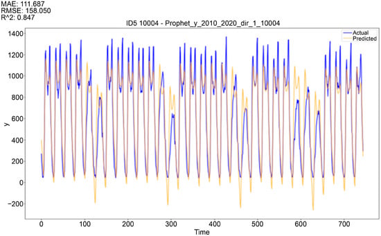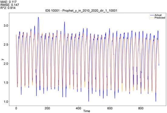 Figure 5 presents the results of predicting the hourly traffic volume at point 10004 using the Prophet model. The blue line represents the actual traffic values, and the yellow line represents the predicted values. For point 10001, the regularity in the past time series patterns (seasonality, periodicity) was confirmed, leading to a high predictive performance, with an MAE of 0.117 and an RMSE of 0.147.