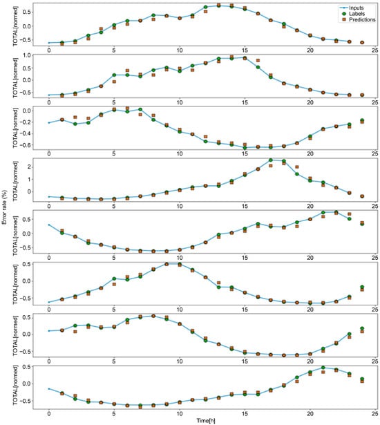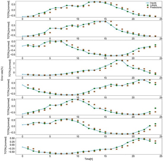 The LSTM model was utilized to evaluate the predictive power of the proposed LSTM model, which incorporates a power function. The predictive accuracy of the LSTM model varies based on the time point, as shown in Figure 6. Owing to the structural limitations of the algorithm, a linear transformation layer is incorporated between the input values (inputs) and the predicted outputs (predictions). This architecture lacks densely nonlinear hidden layers between the input and output layers, which, while enhancing the computational speed, considerably diminishes the predictive performance.