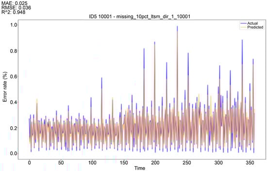 Table 6 presents the evaluation results of the LSTM model at point 10001 under two scenarios, each assuming different data missing rates. The analysis indicated that scenario 2, with a higher missing rate, outperformed scenario 1, which had a lower missing rate. This suggests that the power-function-based LSTM model can effectively capture long-term trends and uncertainties in the traffic volume data. However, a higher missing rate does not universally ensure better predictions. If the points or times with significant missing data are randomly selected, the prediction performance at a 50% missing rate might actually deteriorate. Figure 9 and Figure 10 present the results for each scenario.