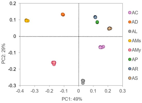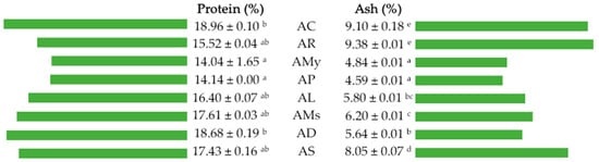Figure 2 illustrates the variations in fat content among different Acacia species, ranging from 1.65% to 4.99%. AP exhibited the lowest ash content, while AR demonstrated the highest. Notably, there is a lack of reported fat values for acacia leaves, although comparatively higher values have been observed in contrast to pods [25]. Significant differences were observed among the analyzed samples regarding fiber composition. AMy exhibited the highest fiber content, at 35.52%, whereas AC exhibited the lowest, at 16.43%. To the best of our knowledge, there are no scientific studies providing specific fiber values for the species studied in our manuscript, so it is not possible for us to make comparisons. The only existing study is that by Kolobe et al. [21], which reported the fiber content of A. hockii, A. karroo, and A. saligna, with values ranging from 5.71 to 25.9%, respectively, for A. hockii and A. karroo. Despite involving different species from those studied in our article, the values found in our work are similar to those published by these authors.