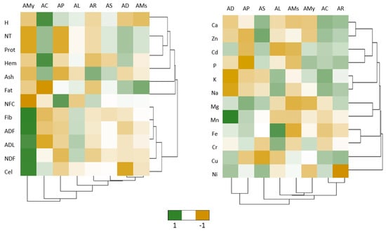 Heat maps plotting clusters of nutritional composition groupings of AMy—A. melanoxylon, AD—A. dealbata, AC—A. cyclops, AR—A. retinodes, AMs—A. mearnsii, AP—A. pycnantha, AL—A. longifolia, AS—A. saligna. Legend: H—humidity; NT—nitrogen total; Prot—protein; Hem—hemicelluloses; Ash—ash; Fib—fiber; ADF—acid detergent fiber; ADL—acid detergent lignin; NDF—neutral detergent fiber; Cel—cellulose; Fat—fat; NFC—non-fibrous carbohydrates; Ca—calcium; Zn—zinc; Cd—cadmium; P—phosphorus; K—potassium; Na—sodium; Mg—magnesium; Mn—manganese; Fe—iron; Cr—chromium; Cu—copper; Ni—nickel.