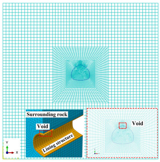 The finite element program ABAQUS 2020 was used to establish a plane model. ABAQUS 2020 software is generally applied for simulating the behavior of tunnel lining structure. The cases of voids behind the tunnel lining were considered and then compared after changing the range, position, and number of voids [21,30]. In this study, when we conducted numerical simulation analysis, the properties of the surrounding rock were determined using an elastic–plastic mechanics model. At present, in the field of geotechnical engineering, people generally choose the ideal elastoplastic model calculation, mainly because (1) the modeling is relatively simple and (2) it allows one to easily obtain numerical simulation parameters using the most common simulation experiments.