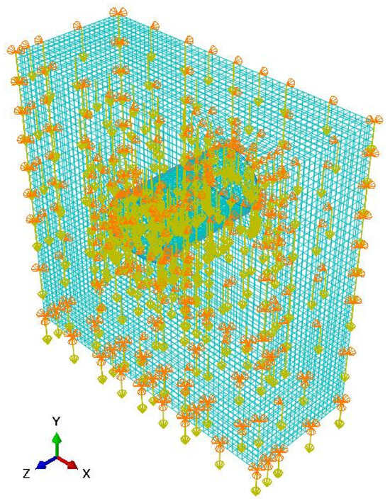 The size range of the calculation model and its boundary conditions were selected according to the analytical requirements of tunnel mechanics. Based on engineering practice experience, the impact of underground engineering is “sufficiently small” in areas outside 3–5 times the tunnel diameter from the center of the tunnel. The calculation range of the tunnel model was taken to be four times the tunnel’s diameter of 48 m, so the height and width of the model are both 100 m, and the longitudinal length of the model was taken to be 30 m. The boundary conditions for the computational model are as follows: X direction constraints were applied to the left and right sides of the model in the X direction, no constraints were applied to the upper boundary in the Y direction, Y direction constraints were applied to the lower boundary in the Y direction, and Z direction constraints were applied to the longitudinal Z direction of the tunnel. The boundary conditions are shown in Figure 4.