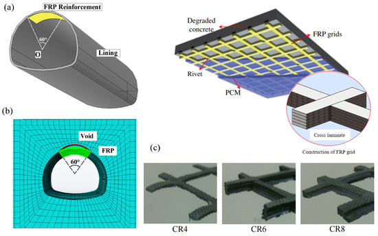 Fiber-reinforced polymer (GFRP) reinforcement and fiber-reinforced concrete (FRC) have also been frequently used in studies on tunnel lining reinforcement [17,18,19]. In contrast, fiber-reinforced plastic with polymer cement mortar (FRP-PCM) represents an efficacious method for tunnel reinforcement, offering benefits such as ease of application, consistent reinforcement outcomes, lightweight characteristics, and high tensile strength [20]. In this study, we aimed to enhance the sensitivity analysis of the reinforcement method by evaluating the impact of voids through an analysis of bending moments and axial forces within the tunnel lining [21]. In hydraulic structures where moisture and aggressive environmental conditions are prevalent, FRP grids help improve the durability and longevity of the concrete. Proper adhesion ensures that the FRP grid can effectively transfer stress and reinforce the structure. The surface texture and resin properties of FRP grids play significant roles in enhancing this bond. This study involved simulating tunnel linings that had been reinforced with FRP and assessing the effects of such reinforcement in tunnels afflicted with various structural problems. The reinforcement effect of the fiber-reinforced polymer and phase change material (FRP-PCM) method on tunnel lining has been discussed in previous work [22,23]. Namli et al. [24] used fiber reinforcement to construct primary (initial) tunnel linings and secondary (final) tunnel linings of metro projects and conducted an analysis in terms of project duration. Caratelli et al. [25] showed it was possible to replace traditional steel reinforcement with glass-fiber-reinforced polymer (GFRP) cages in precast concrete tunnel segmental lining. Wang et al. [26] analyzed and evaluated the structural safety of the Jiao Xiling Tunnel through determining the influence of voids on the tunnel lining structure. Zhang et al. [27] studied the influence of a void behind a side wall and another void on the stress of tunnel lining under different lateral pressure coefficients. Ye et al. [28] analyzed the existence of voids behind the lining from the perspective of design, construction, and operation and studied the influence law of the position and size of the voids with respect to the structure. In this study, we endeavored to furnish insights into the alterations observed in both rock and liner attributable to the presence of voids between these structures. We present a quantitative discussion on the impacts of such voids on the stress and deformation responses of the liner and surrounding rock formations. As shown in Figure 1 and Figure 2 [29], the formation of voids behind a tunnel can also lead to issues such as insufficient lining thickness and exposure of internal reinforcement. In traditional approaches, sensitivity analyses are often limited by the simplified assumptions made regarding the mechanical properties of materials and the interaction between tunnel lining and voids. Previous studies have shown that FRP reinforcement can improve the tensile capacity of tunnel linings and reduce crack propagation, thus enhancing structural integrity. Despite the extensive use of FRP in tunnel reinforcement, there is limited knowledge on the combined effects of FRP grids and polymer cement mortar (PCM), particularly in the context of void defects in tunnel linings. The long-term behavior of tunnel linings reinforced with FRP-PCM under time-dependent factors, such as creep, has not been fully explored. Most studies do not account for time-dependent degradation or how FRP-PCM systems perform under long-term loading conditions. Current sensitivity analyses lack the precision to capture the full range of structural responses to small changes in void characteristics, leaving gaps in our understanding of how FRP-PCM reinforcement performs under varying void conditions and sizes.