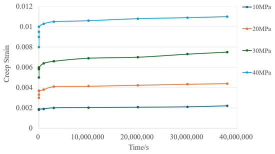 After the static analysis in step 1, a stress field was generated within the structure, and the calculation of the parameters of the creep process could proceed. The creep calculation was mainly divided into two parts: obtaining the creep model parameters of the material and setting up the creep analysis step.