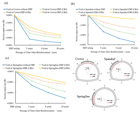 The section repair rates of different void positions under the creep effect: (a) void at the crown; (b) void at the spandrel; (c) void at the springline.