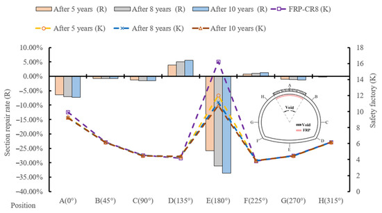 As shown in Figure 13, after 5, 8, and 10 years, the section repair rates at different positions show how effective the reinforcement is in repairing or stabilizing the tunnel lining over time. The largest section repair rate improvements can be observed at position E (180°), indicating that this area, typically the invert or bottom of the tunnel, experiences the greatest benefit from reinforcement measures. In contrast, positions such as A (0°), B (45°), and F (225°) show negative section repair rates, meaning that these areas either continue to deteriorate or did not significantly benefit from reinforcement over the time period. The results show that the CR8 FRP consistently performs the best, reducing the decline in safety factors more effectively compared to CR4 and CR6. Additionally, the spandrel position shows the most significant improvement when reinforced with FRP, while the crown and springline positions still experience moderate declines in safety factors over time, despite FRP reinforcement. When lining is built without FRP reinforcement, the safety factor declines are considerably worse in all locations, indicating the critical importance of FRP reinforcement for long-term tunnel stability. FRP grids, especially CR8, play a crucial role in maintaining tunnel stability over time. The spandrel position benefits the most from FRP reinforcement, while the crown and springline positions still experience safety factor decreases, albeit less than in cases without reinforcement. The data suggest that the higher-grade FRP (CR8) is the most effective at mitigating the reduction in safety factors, particularly over longer time frames.