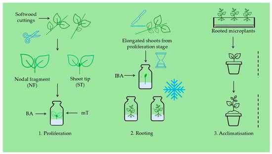 Micropropagation stages of L. var. emphyllocalyx; BA—6-benzyl adenine, mT—meta-topolin, IBA—(1H-indol-3-yl)butanoic acid.