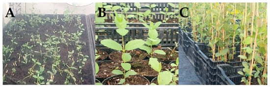 Acclimatiszation of Japanese hascap clones in controlled environment (A), initially acclimatised plantlets grown in shade in pots (B), fully acclimatiszed micropropagated plants in nursery (C).