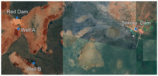 In the specific area where the delegation worked, most of the villagers’ drinking water comes from local sources such as wells (Figure 1) and two local reservoirs dammed by the Red Dam and the Sokoru Dam (Figure 1 and Figure 2a,b, respectively). These dams present significant environmental and health challenges, such as the bacteria, organic matter, and feces that contaminate them due to exposure to local livestock. Aside from boiling, no additional treatment is employed to purify the contaminated drinking water prior to consumption. Figure 2c presents a typical case where livestock herds enter the water and defecate on its banks, leading to contamination.