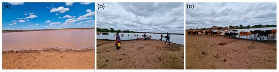 Images of local water sources for animal and human consumption: (a) Red Dam, mainly used to serve animals but also as a drinking water source for residents from some local villages; (b) Sokoru Dam (showing human consumption); (c) Sokoru Dam (showing animal consumption).